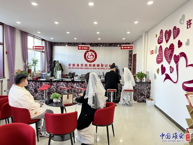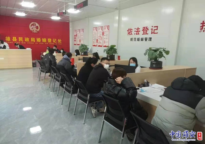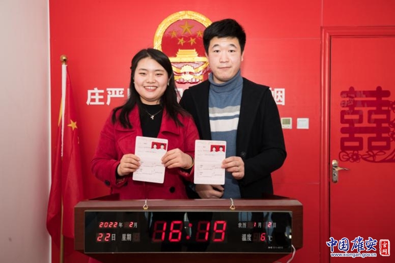 中国雄安官网2月24日电(李元闯)2022年2月22日,恰逢星期二,也是壬寅虎年正月二十二,因“2”谐音“爱”,被网友称为2022年“最有爱”的一天。在万物萌生的雄安新区,很多准新人选择在这个“成双成对”的日子里结为合法夫妻,许下对彼此最庄严的承诺,相伴在这片热火朝天的土地上继续扎根向上。为满足群众在“婚姻潮日”登记的美好愿望,在雄安新区公共服务局指导下,三县民政局婚姻登记处通过增派人手、分区服务、延长工作时间等方式,为准新人们提供登记服务、婚姻辅导、法律咨询及婚俗文化讲解等多样服务。