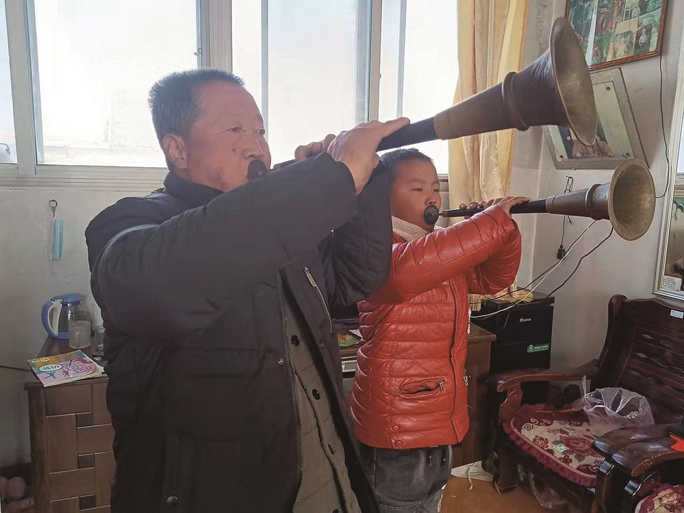 孩子在跟柴玉江学吹唢呐。张莉 摄