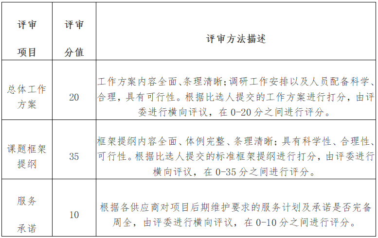 本次比选采购采用综合评分法,总分100分,其中技术部分65分、商务部分20分、价格部分15分。比选小组将对提交最后报价的合格供应商从技术、商务及报价部分分别进行评分,并汇总出技术、商务及报价部分的综合得分。综合得分最高的供应商将被推荐为第一成交候选供应商,综合得分第二高的供应商将被推荐为第二成交候选供应商,其他候选供应商以此类推。如果出现相同的综合得分,则最后技术分高的供应商排序在前优先推荐;如果最后技术分仍相同,则商务部分得分高的供应商优先排序在前推荐。评分过程中采取四舍五入法,保留小数2位。