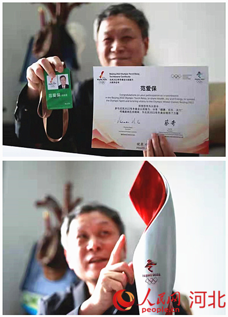 作为河北省森林防火专家组组长的范爱保,最难忘的是他作为2022年北京冬奥会火炬手的“高光时刻”。2022年2月4日约12时40分,在张家口张北县的德胜村,作为第二组的第十二棒,短短的几十米的距离,范爱保收获了无比的自豪与骄傲。