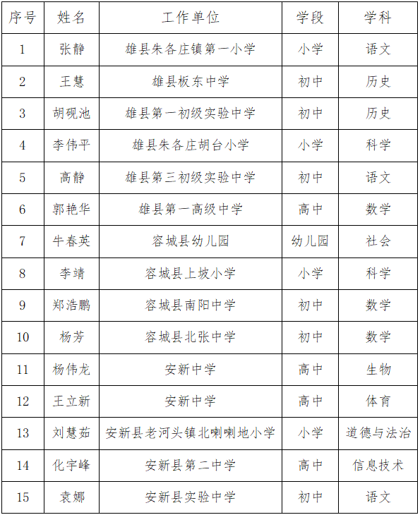 根据《河北省教育厅关于评定河北省中小学(幼儿园)骨干教师的通知》要求,经三县教育局推荐,雄安新区公共服务局组织专家评审,拟推荐上报省级骨干教师候选人15名,现予以公示。公示期为2022年3月15日-3月19日。