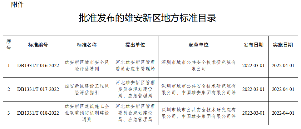 河北雄安新区管理委员会改革发展局会同应急管理局等部门组织制定了《雄安新区城市安全风险评估导则》等三项雄安新区地方标准,现予以通告(详细目录见附件)。