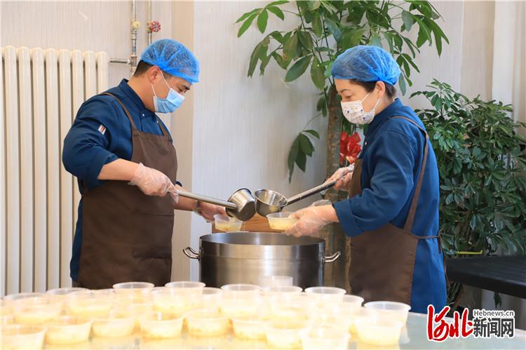 图为固安县供餐单位工作人员在分装打包鸡蛋汤。