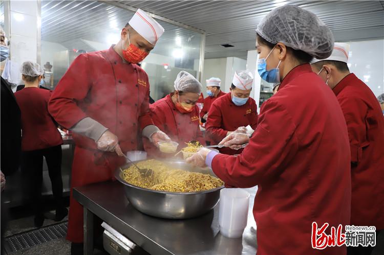 图为固安县供餐单位工作人员正在将热菜装盒打包。