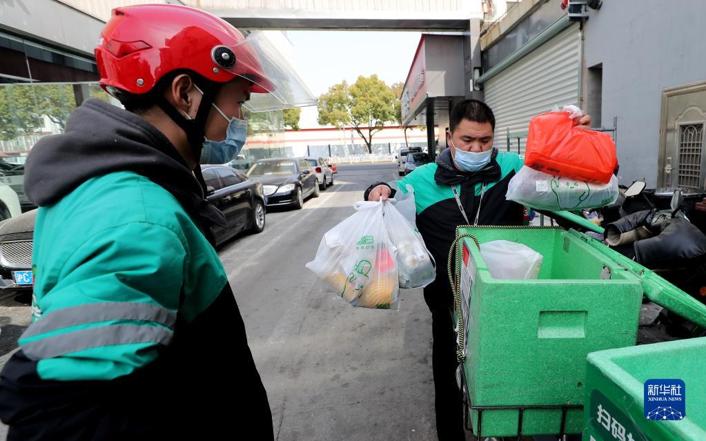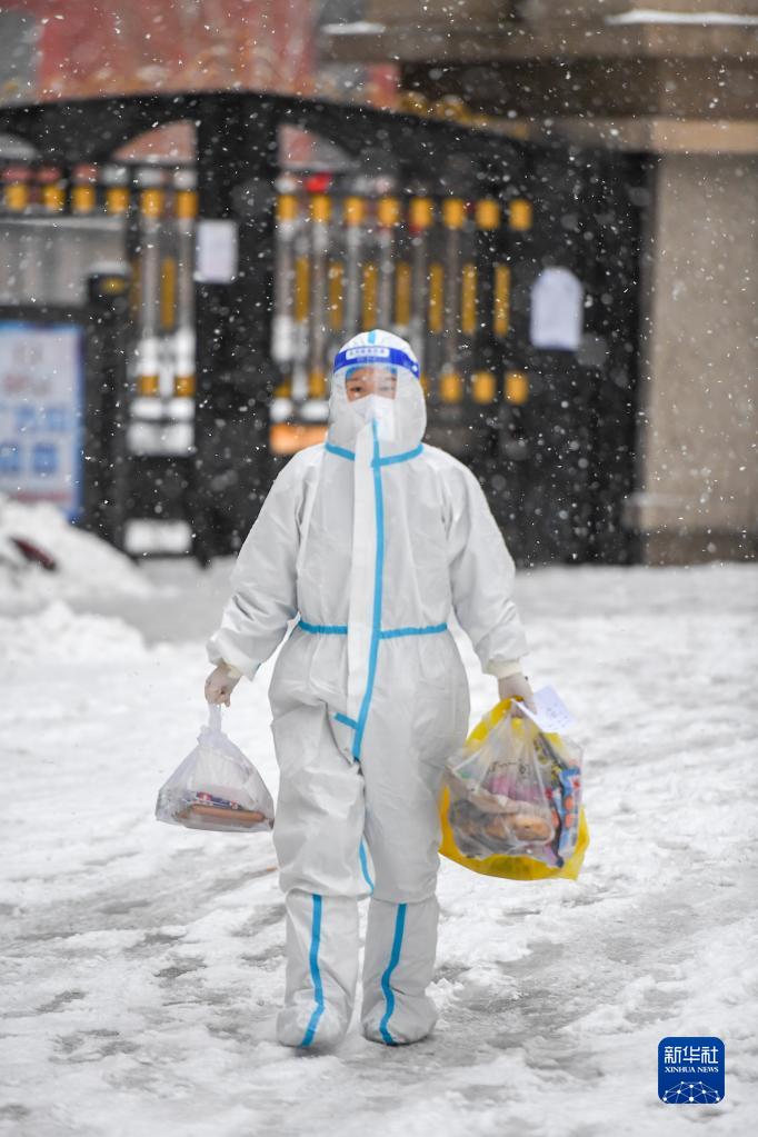 3月15日,吉林省吉林市昌邑区兴华街道中兴社区网格员宋冉为隔离居民运送生活物资。新华社记者张楠 摄
