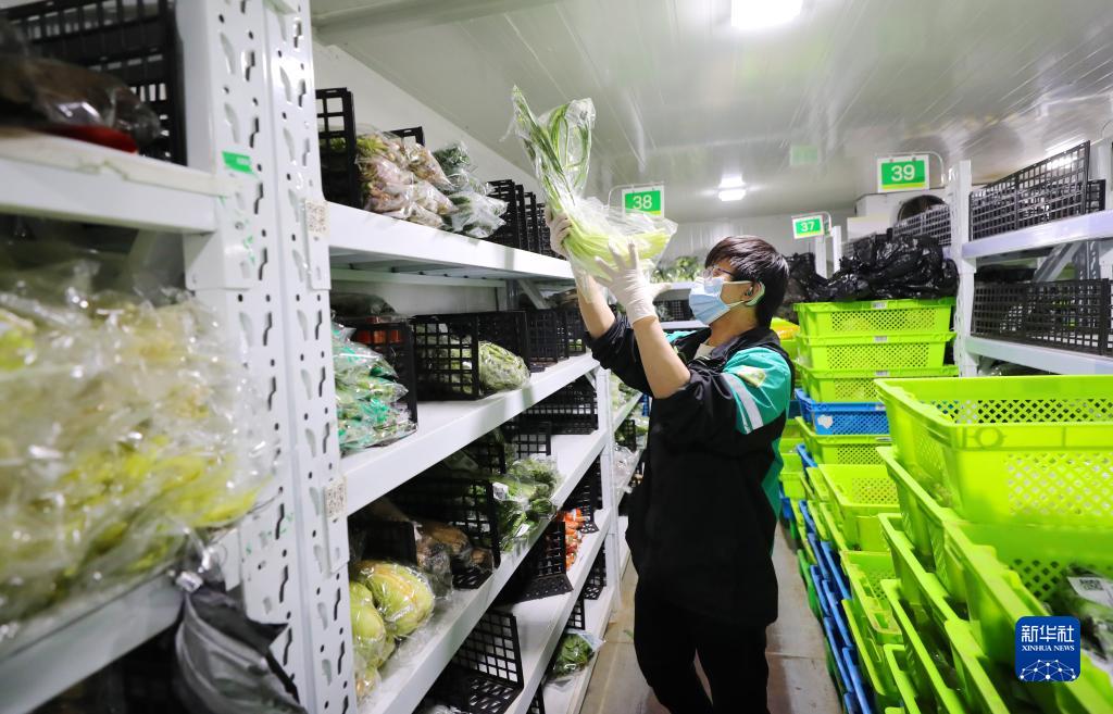 3月15日深夜,在位于上海闵行区老沪闵路的一家网络购物平台仓配站点,工作人员在冷藏库内将新到货的蔬菜分类摆放到货架上。新华社记者方喆 摄