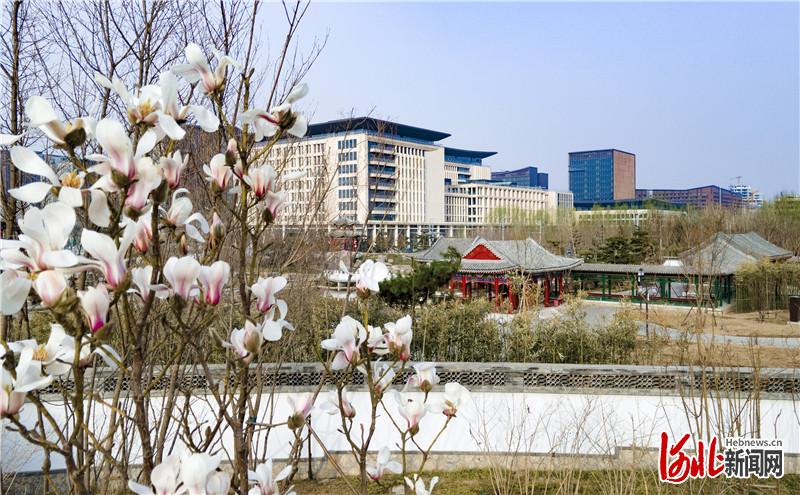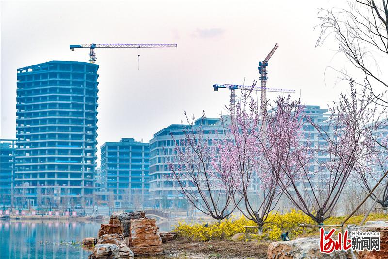 3月15日,位于雄安新区的金湖公园内,迎春和山桃竞相开放,不远处的“未来之城”正拔节生长。雄安新区这座承载千年大计、国家大事的“未来之城”正乘着春风,加快“显雏形、出形象”,绽放光彩。河北日报记者赵海江 摄