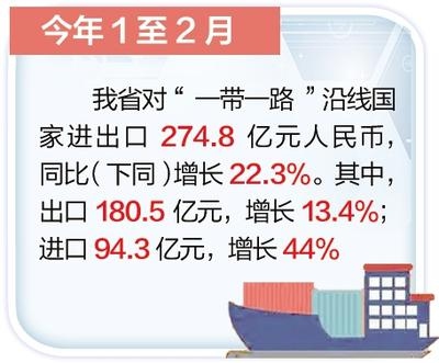 1至2月,我省对“一带一路”西亚北非16国进出口高居首位,且增长较快,进出口95.8亿元,增长52.5%;对“一带一路”东南亚11国进出口83.2亿元,增长14.4%;对“一带一路”蒙俄及中亚等7国进出口42.7亿元,增长13.1%。