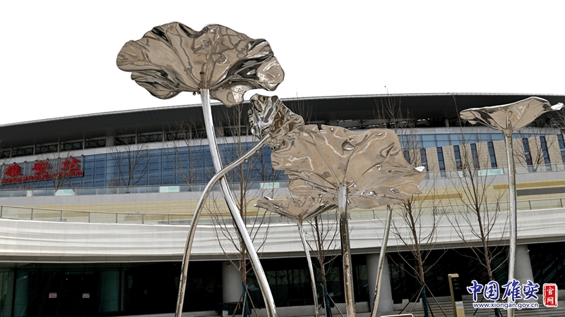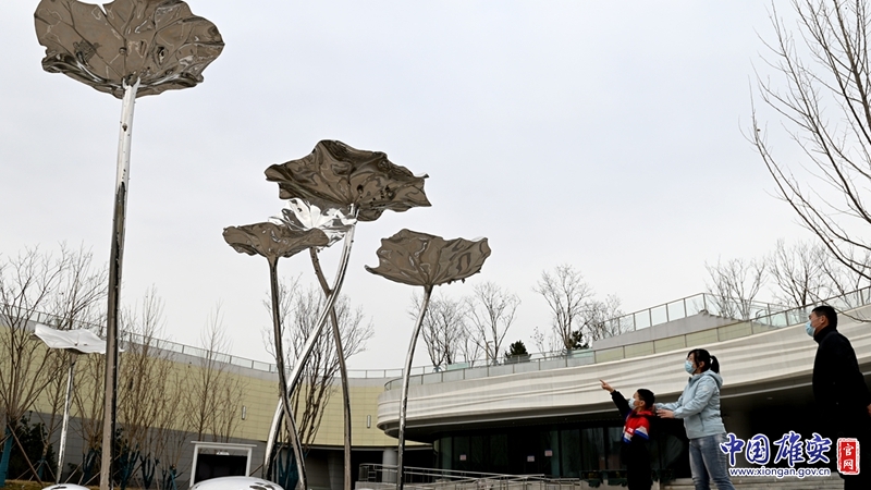 3月28日,游客在雄安站站前广场欣赏刚落成的不锈钢组雕《青莲滴露》。李秀哲 摄