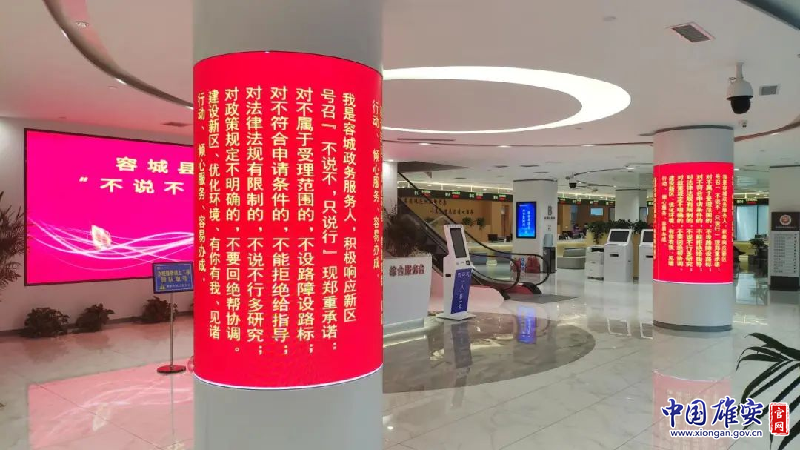 中国雄安官网3月30日电(李元闯)阳春三月,走进容城县政务服务中心,首先映入眼帘的是两个柱状柔性屏,屏幕上滚动展示着“不说不”行动承诺。这是按照雄安新区党工委、管委会要求,容城县行政审批局全体党员带领所有驻厅人员作出的服务承诺,这也是他们的庄严宣誓和“冲锋号”。