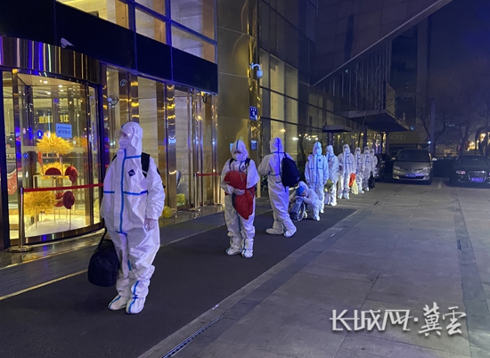 转移的重点人员在隔离酒店门口排队等待进入酒店。