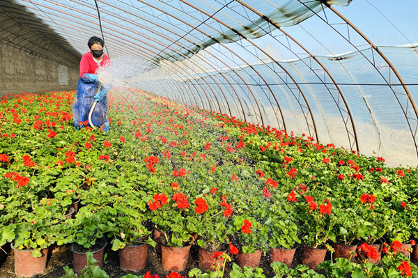 花农在广阳区北旺镇相士屯村盛园花卉种植基地,为天竺葵浇水。苏克怡 摄