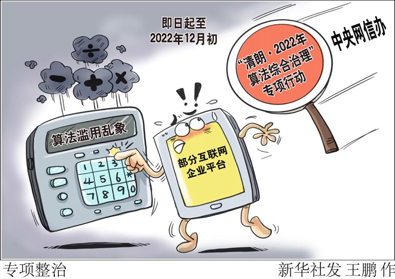 新华社北京4月8日电(记者王思北)记者8日从中央网信办获悉,中央网信办牵头开展“清朗·2022年算法综合治理”专项行动,即日起至2022年12月初,将深入排查整改互联网企业平台算法安全问题,重点检查具有较强舆论属性或社会动员能力的大型网站、平台及产品,督促企业利用算法加大正能量传播、处置违法和不良信息、整治算法滥用乱象。