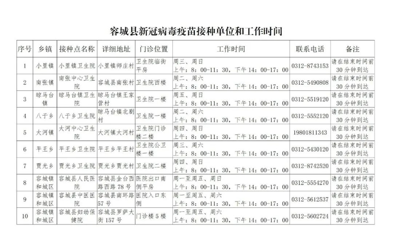 为统筹做好新冠病毒疫苗接种和其他各项工作,结合各接种门诊硬件设置和人员配置情况,现对新冠病毒疫苗接种单位和工作时间公示如下: