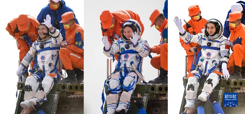 4月16日,神舟十三号载人飞船返回舱在东风着陆场成功着陆。这是航天员翟志刚、王亚平、叶光富(左至右)安全顺利出舱(拼版照片)。新华社发