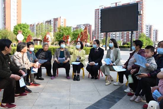 4月19日,在威县好人公园,检察官、家庭教育公益讲师、妇联工作人员向群众宣传家庭教育促进法。刘永格 摄