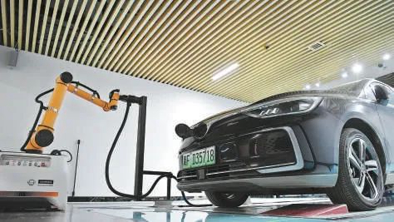 在雄安新区剧村变电站智慧充电区,插拔枪机器人对一辆电动汽车进行充电。新华社发