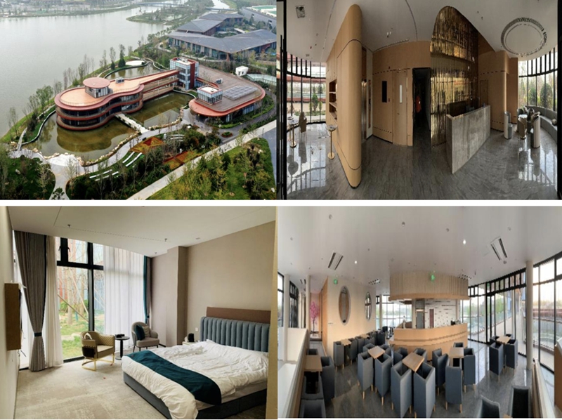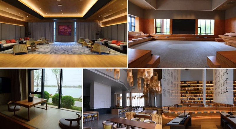 主体建筑呈品字形布局,地下停车场+地上两层客房、餐厅、会议室、健身房,拥有地上及地下车位47个,停车便捷。现有客房48间,含两栋独立式别墅客房,带有临湖独院,可观澜听涛。主推业态:汉文化特色酒店、民宿。