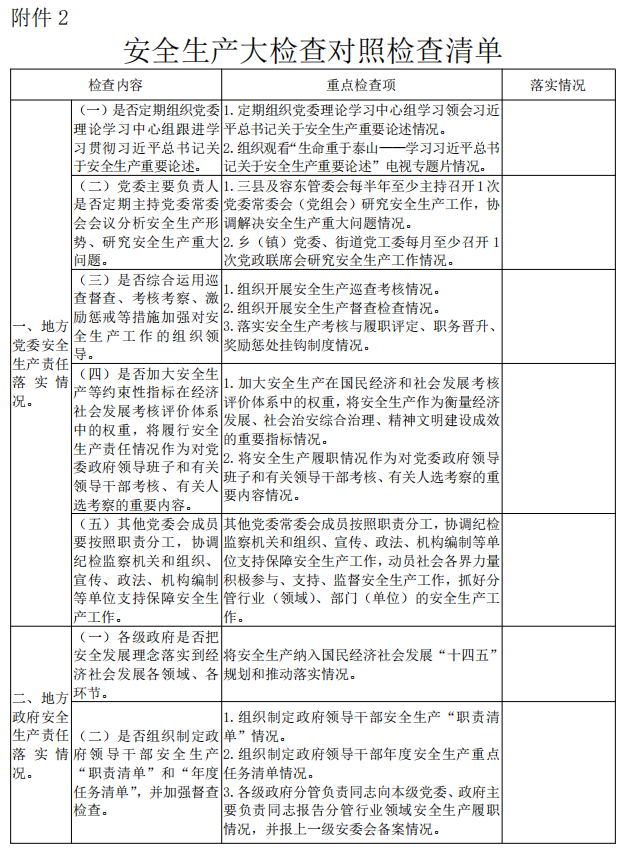 紧紧围绕贯彻落实习近平总书记关于安全生产重要指示精神,全面执行国务院安委会关于加强安全生产工作的十五条硬措施(安委〔2022〕6号)开展安全生产大检查。重点检查以下内容: