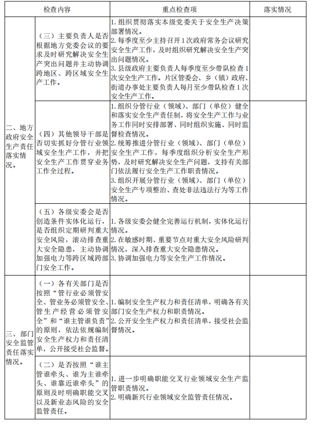(二)地方政府安全生产责任落实情况。各级政府是否把安全发展理念落实到经济社会发展各领域、各环节,主要负责人是否根据地方党委会议的要求及时研究解决安全生产突出问题并主动协调跨地区、跨区域安全生产工作,其他领导干部是否切实抓好分管行业领域安全生产工作、安委办运行情况等。