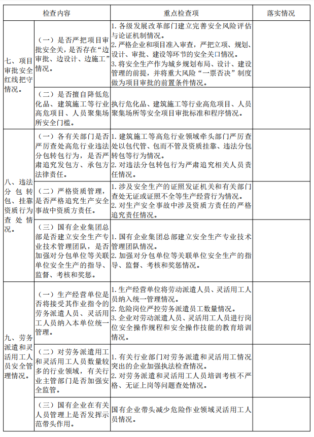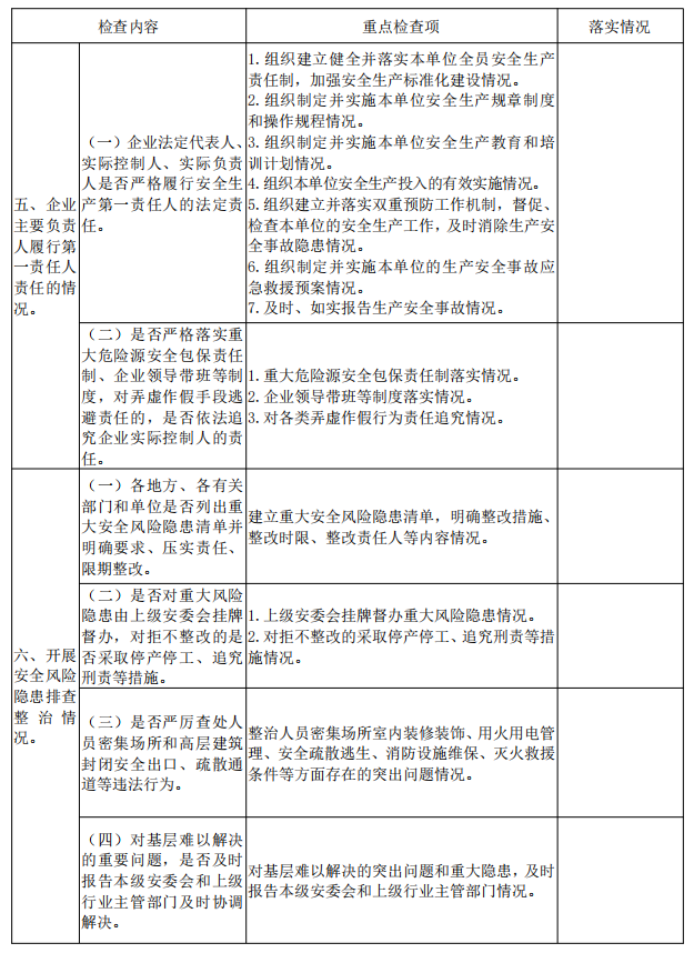 (六)开展安全风险隐患排查整治情况。各级各有关部门是否列出重大安全风险隐患清单并明确要求、压实责任、限期整改,是否严厉查处人员密集场所封闭安全出口、封闭疏散通道等违法行为,是否由上级安委会挂牌督办重大隐患,对拒不整改的是否停产停工、追究刑责,对基层难以解决的问题是否及时报告等。