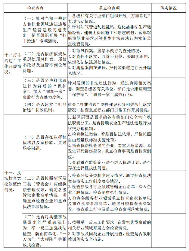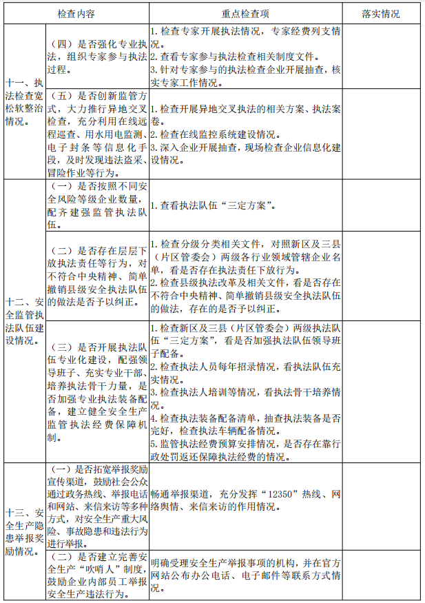 (十一)执法检查宽松软整治情况。安全生产监管执法是否存在选择性执法以及宽松软、走过场等问题,是否明确各有关部门安全生产执法职责分工,是否确定新区及三县(片区管委会)两级执法管辖企业名单并明确重点检查企业,是否针对事故暴露问题举一反三加强执法检查,是否组织专家参与执法过程、推进异地交叉检查,是否利用新技术、信息化手段及时发现违法行为等。