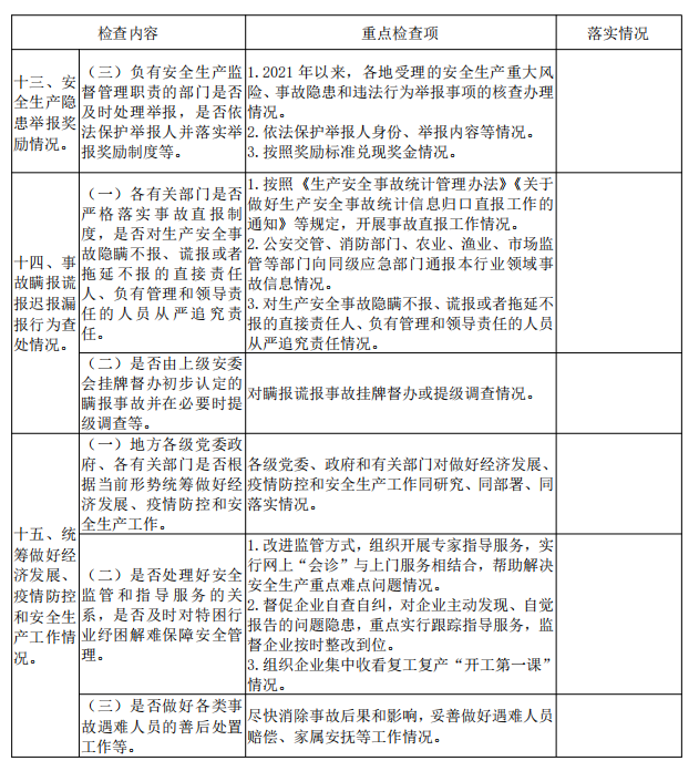 (十五)统筹做好经济发展、疫情防控和安全生产工作情况。地方各级党委政府、各有关部门是否根据当前形势统筹做好经济发展、疫情防控和安全生产工作,是否处理好安全监管和指导服务的关系,是否及时对特困行业纾困解难保障安全管理,是否发挥一线人员做好安全生产工作的主动性,是否做好各类事故遇难人员的善后处置工作等。