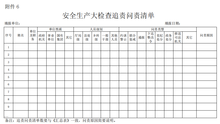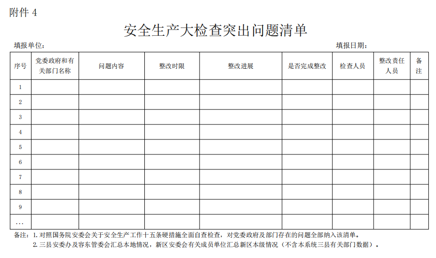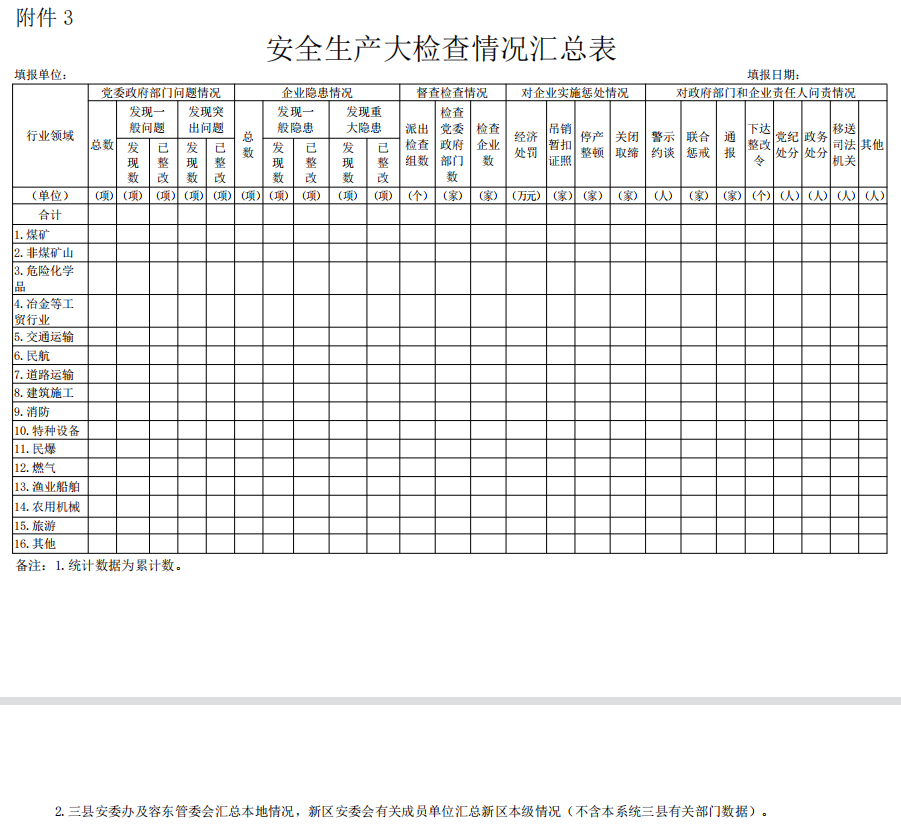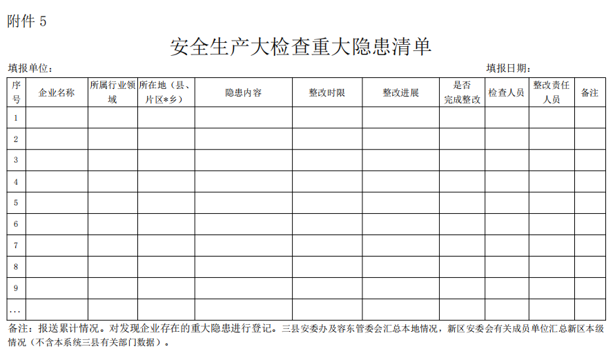 (五)加强统计报送。三县、容东管委会大检查方案及雄安新区宣传网信局、改革发展局、规划建设局、公共服务局、生态环境局、综合执法局、应急管理局、公安局、住房管理中心、消防救援筹备组专项检查方案务于5月7日前报新区安委办,其他各有关单位、部门也要结合工作实际,细化工作方案,有效推动工作落实。三县、容东管委会、新区党群工作部、宣传网信局、改革发展局、规划建设局、公共服务局、生态环境局、综合执法局、应急管理局、公安局、住房管理中心、消防救援筹备组及雄安集团按照《安全生产大检查对照检查清单》(附件2)进行自查的情况于5月7日报新区安委办。各级各有关成员单位每月28日前(遇节假日提前)统计报送《安全生产大检查情况汇总表》《安全生产大检查突出问题清单》《安全生产大检查重大隐患清单》《安全生产大检查追责问责清单》(附件3-6)。同时,要结合安全生产工作定期统计报告制度,定期向新区安委办报送工作信息,及时反映大检查中典型经验做法、工作进展情况。
