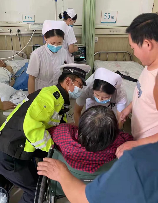 当时,正在附近小学值守护学岗勤务的民警赵鹏闻讯赶来。看到孩子痛苦的样子,赵鹏立即尝试着将孩子的右脚从车轮里拔出来,但没有成功。随之,赵鹏赶紧拨打了119电话求助。在消防队员的帮助下,孩子的脚被取了出来。此时,孩子已是疼痛难忍,鲜血淋漓,脚面也肿得老高。为了尽快送往医院救治,赵鹏帮助徐女士拦停了一辆出租车,并骑着警用摩托车为出租车开道,一路护送至市医院急救中心。到达医院后,赵鹏又从出租车里抱起孩子一气奔跑进急救室。当赵鹏离开医院,徐女士问其姓名时,赵鹏只是说了一声:“这是我们应该做的。”
