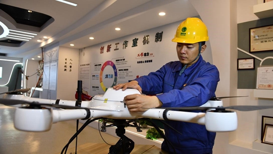 程旭在创新工作室检查无人机,使用无人机巡线已经10年,输电运检中心从拥有1架发展成40架无人机。受访者供图
