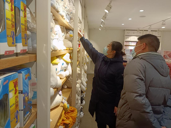 香河县市场监督管理局知识产权管理保护股执法人员检查玩具店售卖冰墩墩、雪融融现场。何立忠 摄