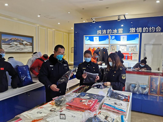张家口市市场监督管理局与张家口市公安局对侵犯冰墩墩的违法行为开展联合检查。赵铁民 摄