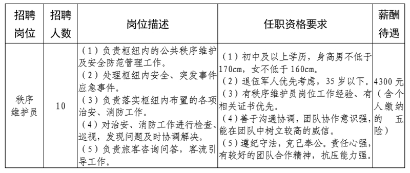 共招聘秩序维护员10名,岗位要求详见下表或招聘报名页面。
