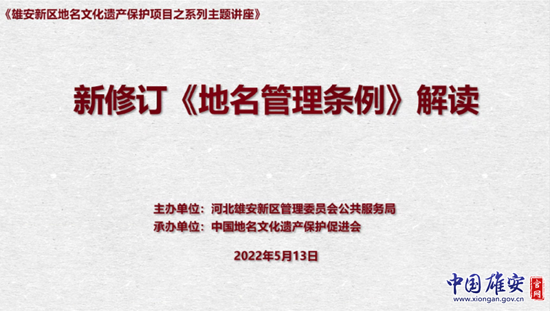 中国雄安官网5月14日电 国务院新修订的《地名管理条例》(以下简称《条例》)已于2022年5月1日正式施行。该《条例》对于更好地传承保护地名文化具有里程碑式意义。为进一步深化对新修订《条例》内容的认识与理解,推动雄安新区地名事业高质量发展,5月13日,雄安新区公共服务局联合中国地名文化遗产保护促进会共同举办了新修订《条例》解读的线上讲座。雄安新区公共服务局相关负责同志出席讲座。