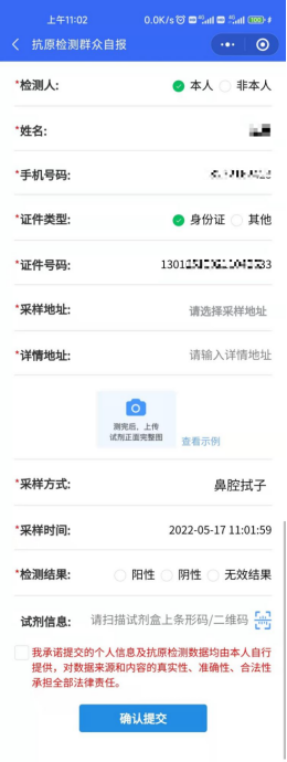 2.点击“抗原检测群众自报”按钮,进入检测结果填报页面,填写上报信息并提交即可。首次登录将进行实名认证和绑定,方便群众再次登录免填身份信息。