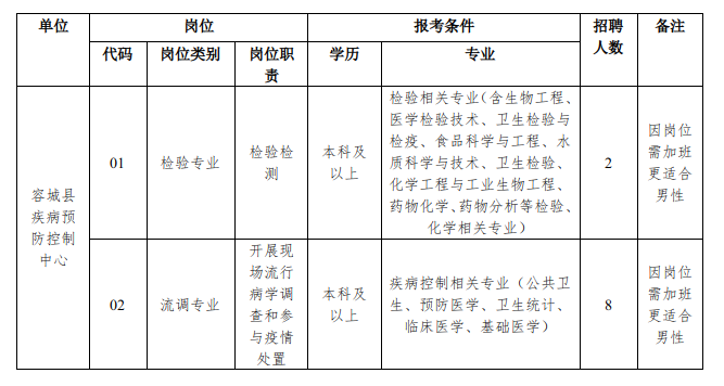 容城县疾病预防控制中心是政府实施疾病预防控制与公共卫生技术管理和服务的公益事业单位。作为传染病疫情及突发公共卫生事件调查处置专业疾病预防控制机构,为切实增强疫情处置能力,有效处置新冠肺炎疫情等突发公共卫生事件,适应当前疾病预防控制工作需要,经县委、县政府批准,拟面向社会公开招聘疾病预防控制中心辅助人员。为保证公开招聘工作顺利实施,现公告如下。