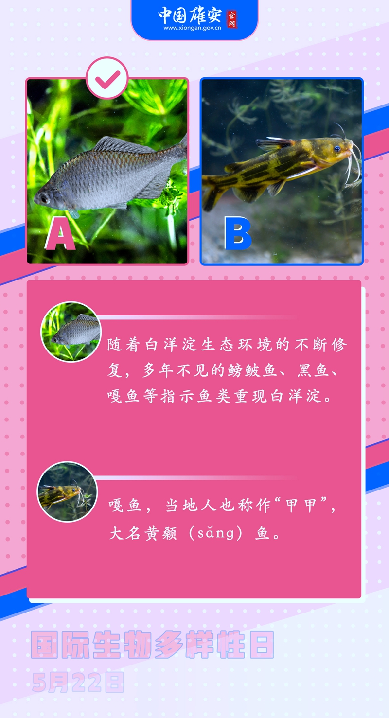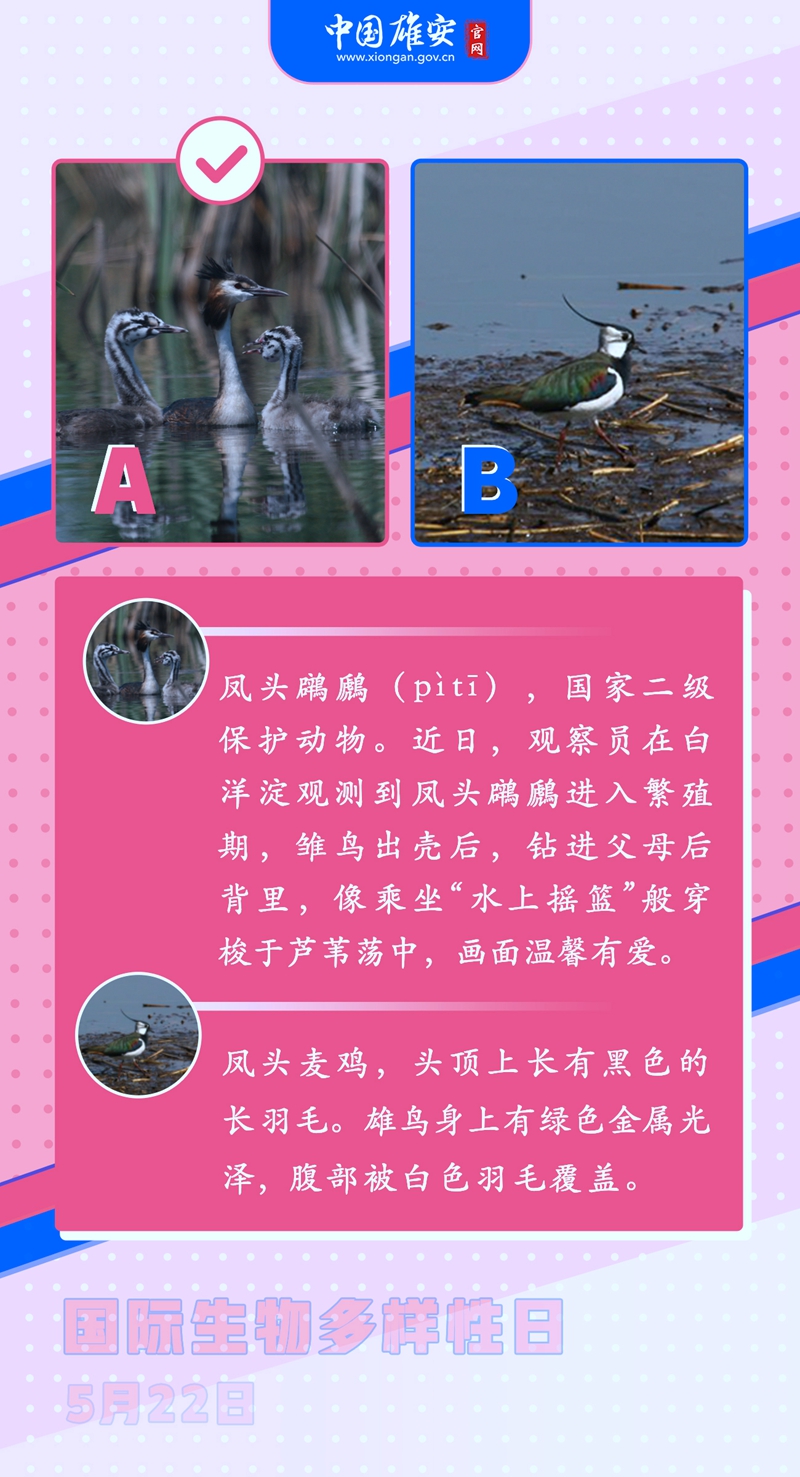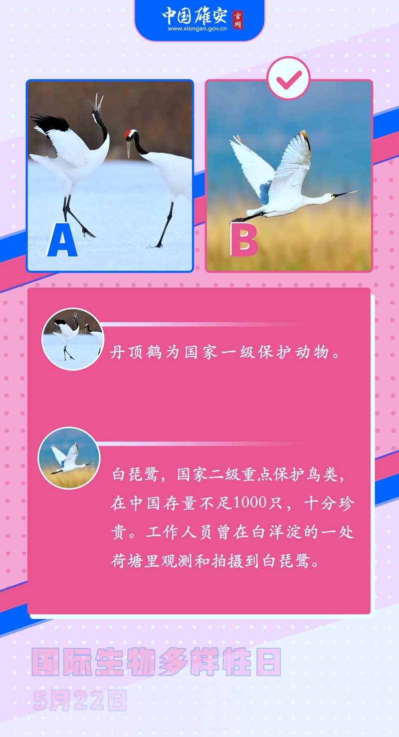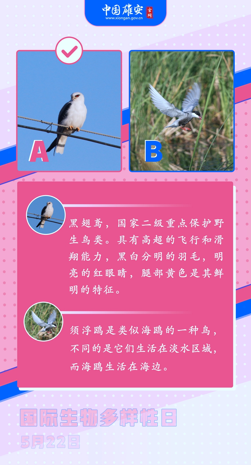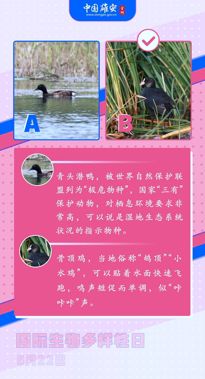 随着生态环境的不断改善,多年不见的鳑鲏鱼重现白洋淀,野生鸟类数量达237种,其中包含国家重点保护动物大鸨、青头潜鸭、灰鹤、黑翅鸢等。今天是国际生物多样性日,这些“小精灵”你认识吗?让我来考考你,准备好了吗?请作答↓↓↓