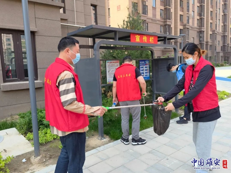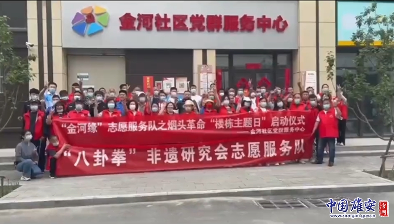 金河社区党员、楼门长和“金河缘”志愿服务队员联合执法三中队、雄安集团志愿者、“八卦拳”非遗研究会志愿者开展“烟头革命”之“楼栋主题日”活动。容东管委会供图