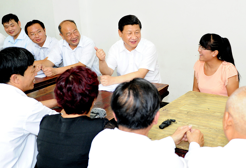 2013年7月11日至12日,中共中央总书记、国家主席、中央军委主席习近平在河北省调研指导党的群众路线教育实践活动。这是习近平在正定县塔元庄村社区综合服务中心看望镇村干部和村民。新华社记者李涛 摄