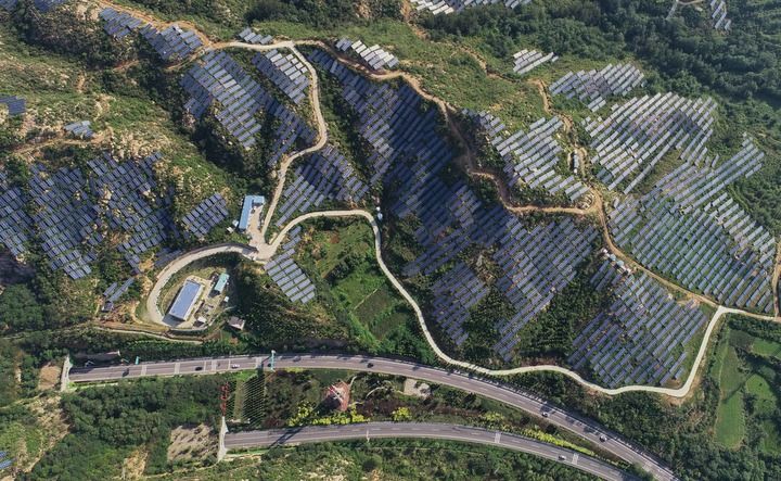 通往西柏坡的高速公路和西柏坡镇一处荒山上的光伏发电场(2019年8月16日摄,无人机照片)。新华社记者杨世尧 摄