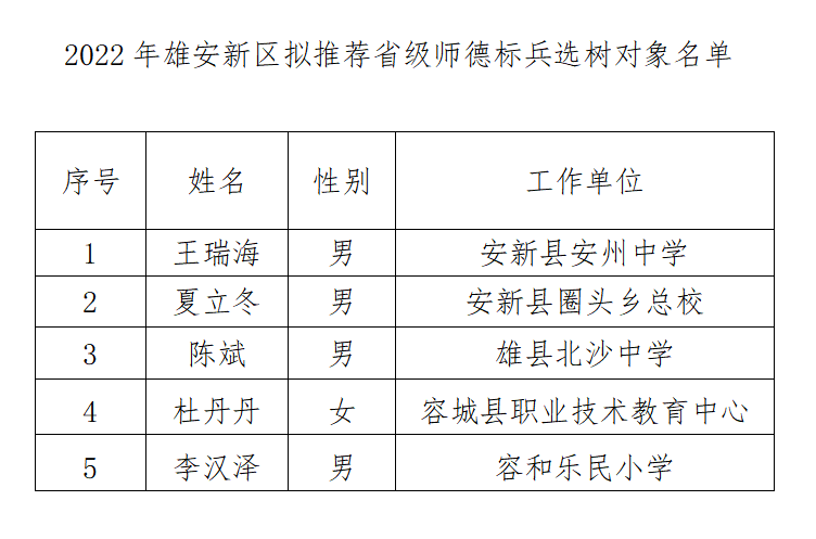 2022年雄安新区拟推荐省级师德标兵选树对象评审工作已经结束。经三县教育局和容和教育总校推荐,雄安新区公共服务局组织评审,拟推荐省级师德标兵选树对象5名,现予以公示,公示时间为5个工作日(5月24日-5月30日)。