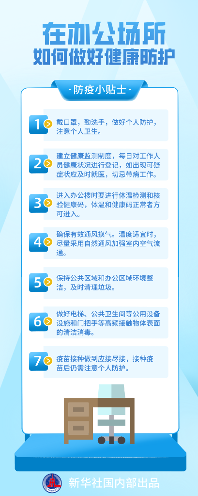 当前,全国日新增本土确诊病例和无症状感染者数量继续下降,但每日仍有10余个省份报告新增本土感染者,疫情防控形势依然严峻复杂。国家卫生健康委疾控局副局长、一级巡视员雷正龙提示,要落实重点场所、重点人群、重点单位防控措施。在办公场所如何做好健康防护?这份来自国家卫生健康委的防护指南请收好。