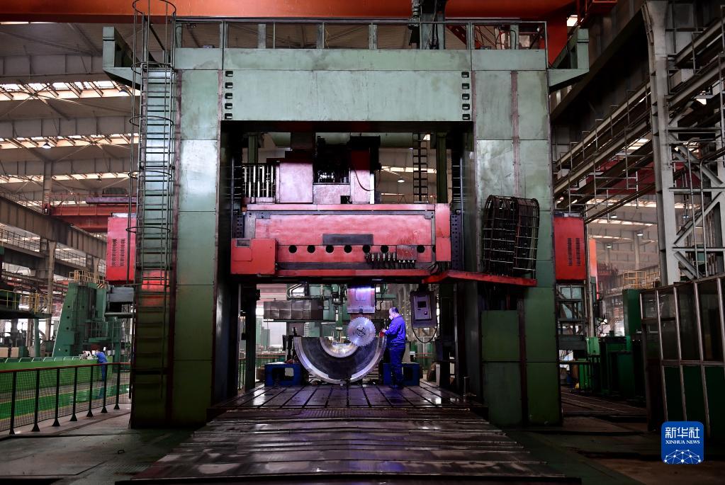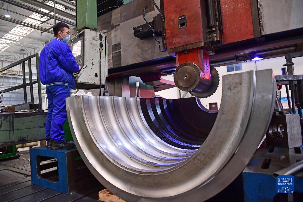 2020年3月16日,在沈阳鼓风机集团股份有限公司生产车间,工人操作机器加工产品内机壳。新华社记者杨青 摄