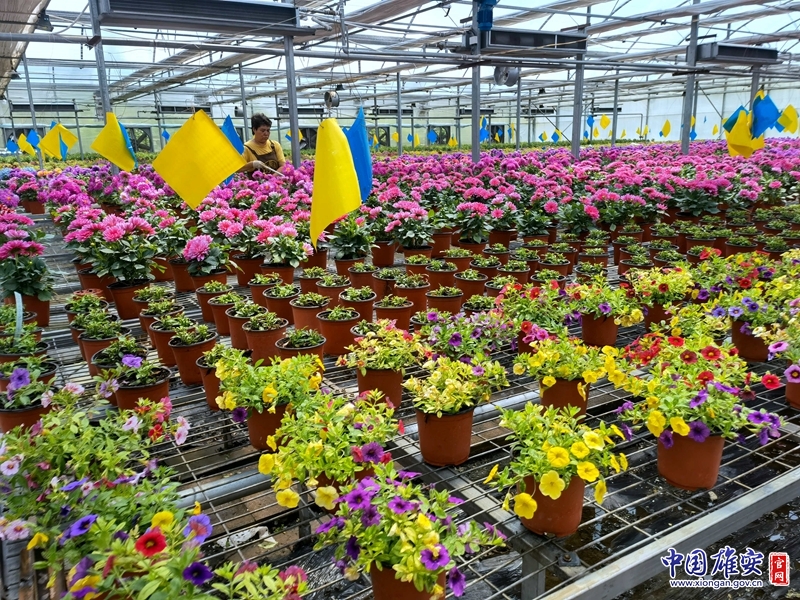 员工正在为棚内花卉浇水。中国雄安官网李雪娇 摄