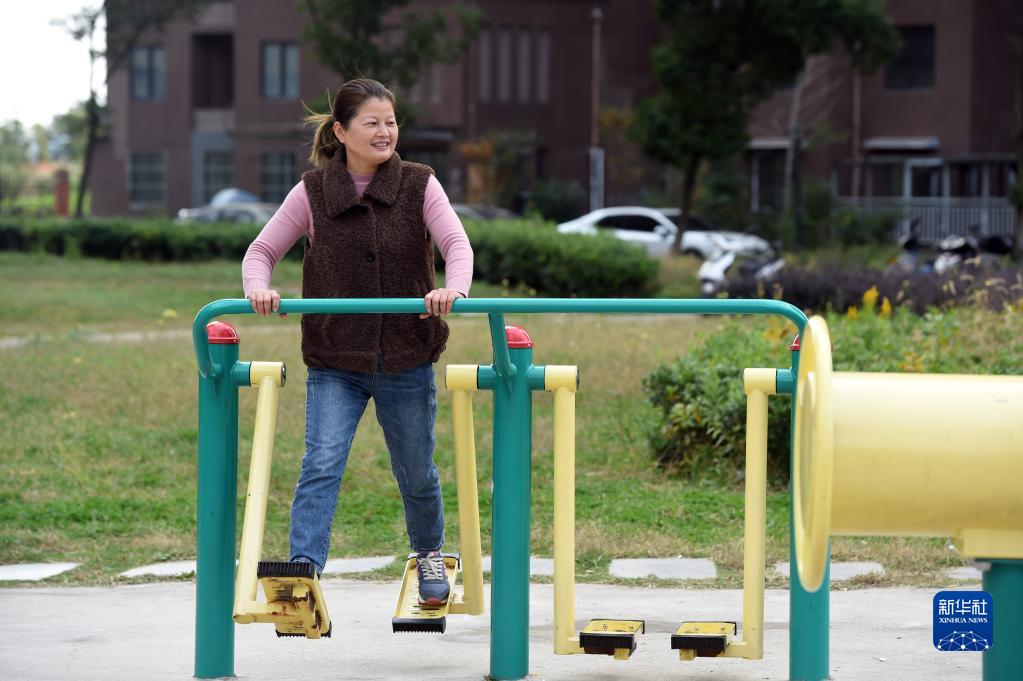 安徽省马鞍山市薛家洼的上岸渔民陈兰香在新家所在的小区里锻炼(2020年10月31日摄)。新华社记者周牧 摄