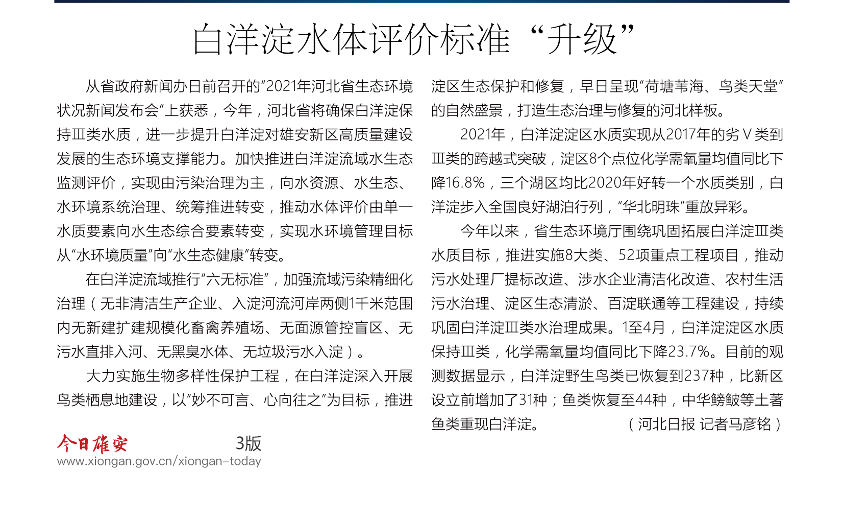 目前的观测数据显示,白洋淀野生鸟类已恢复到237种,比新区设立前增加了31种;鱼类恢复至44种,中华鳑鲏等土著鱼类重现白洋淀。
