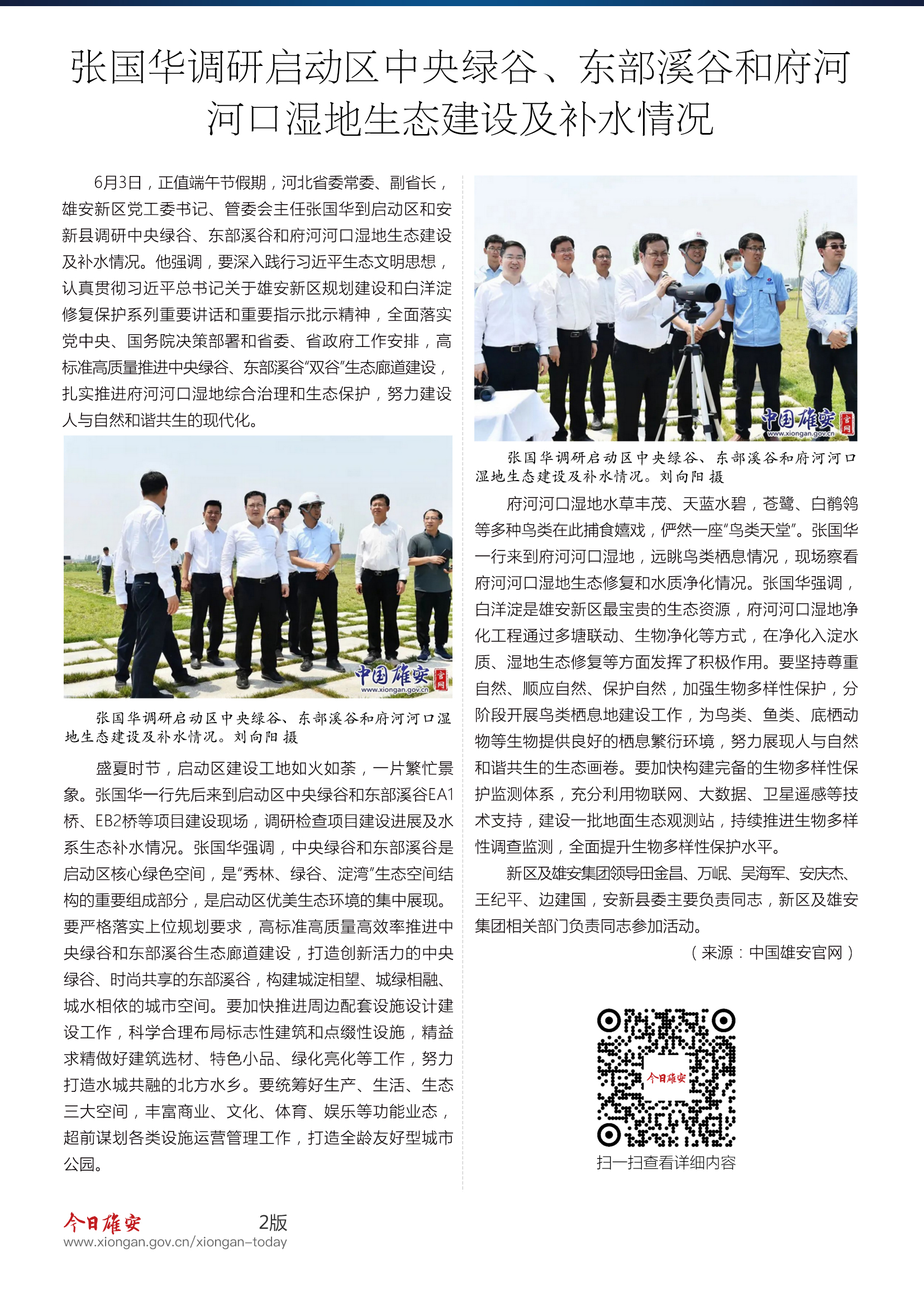 时政播报丨张国华调研启动区中央绿谷、东部溪谷和府河河口湿地生态建设及补水情况