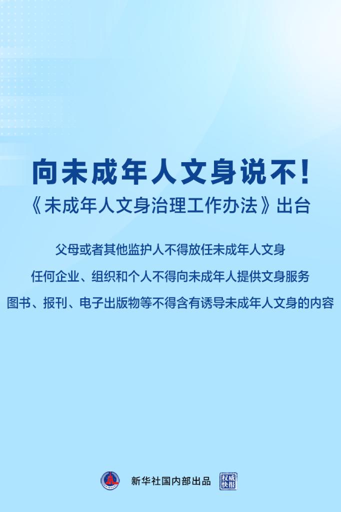 近年来,未成年人文身现象引发社会广泛关注。为加强未成年人文身治理,保护未成年人身心健康,国务院未成年人保护工作领导小组办公室6日印发《未成年人文身治理工作办法》。办法推出哪些举措治理未成年人文身现象?如何落实这些举措?国务院未成年人保护工作领导小组办公室有关负责人回答了记者的提问。