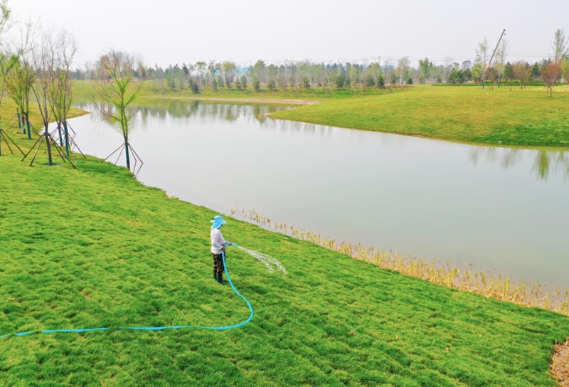 6月9日,在雄安新区启动区中央绿谷及东部溪谷项目现场,养护工人在为草地浇水灌溉。河北日报记者史晟全 摄