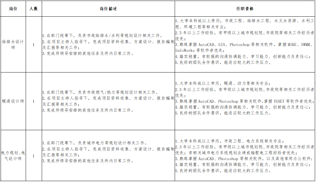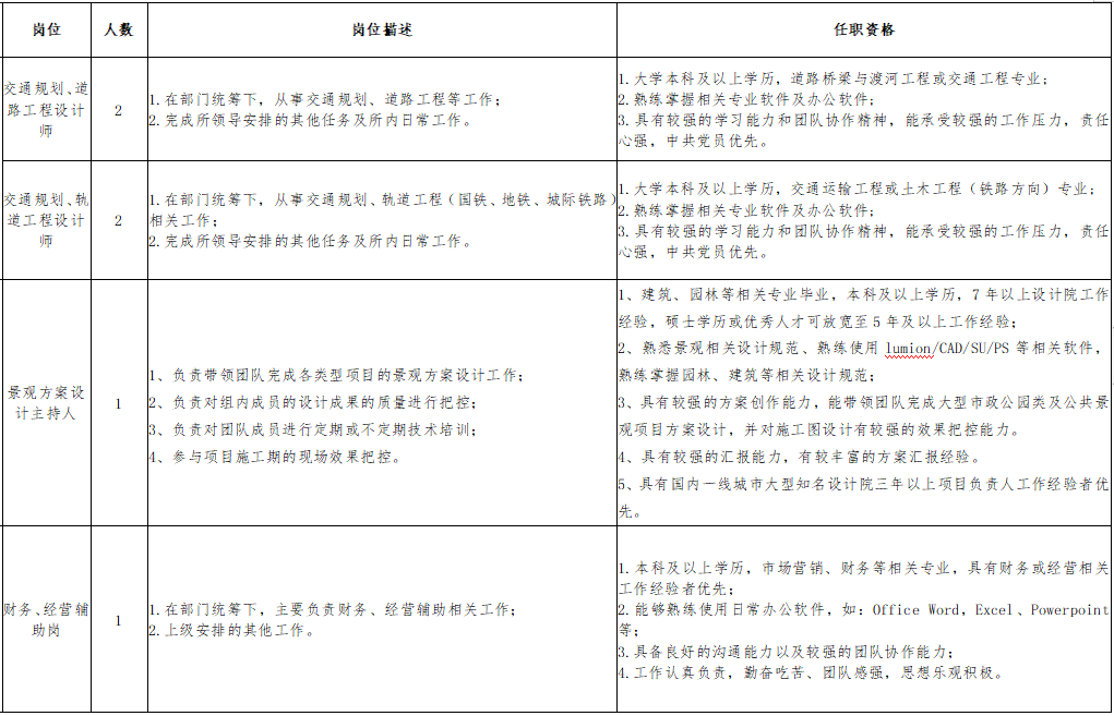 河北雄安人力资源服务有限公司(以下简称雄安人力公司)根据工作需要,现面向社会公开招聘业务外包员工,工作地点在雄安新区,从事交通规划、道路、轨道工程设计、给排水设计、景观方案设计等以及财务、经营辅助相关工作。